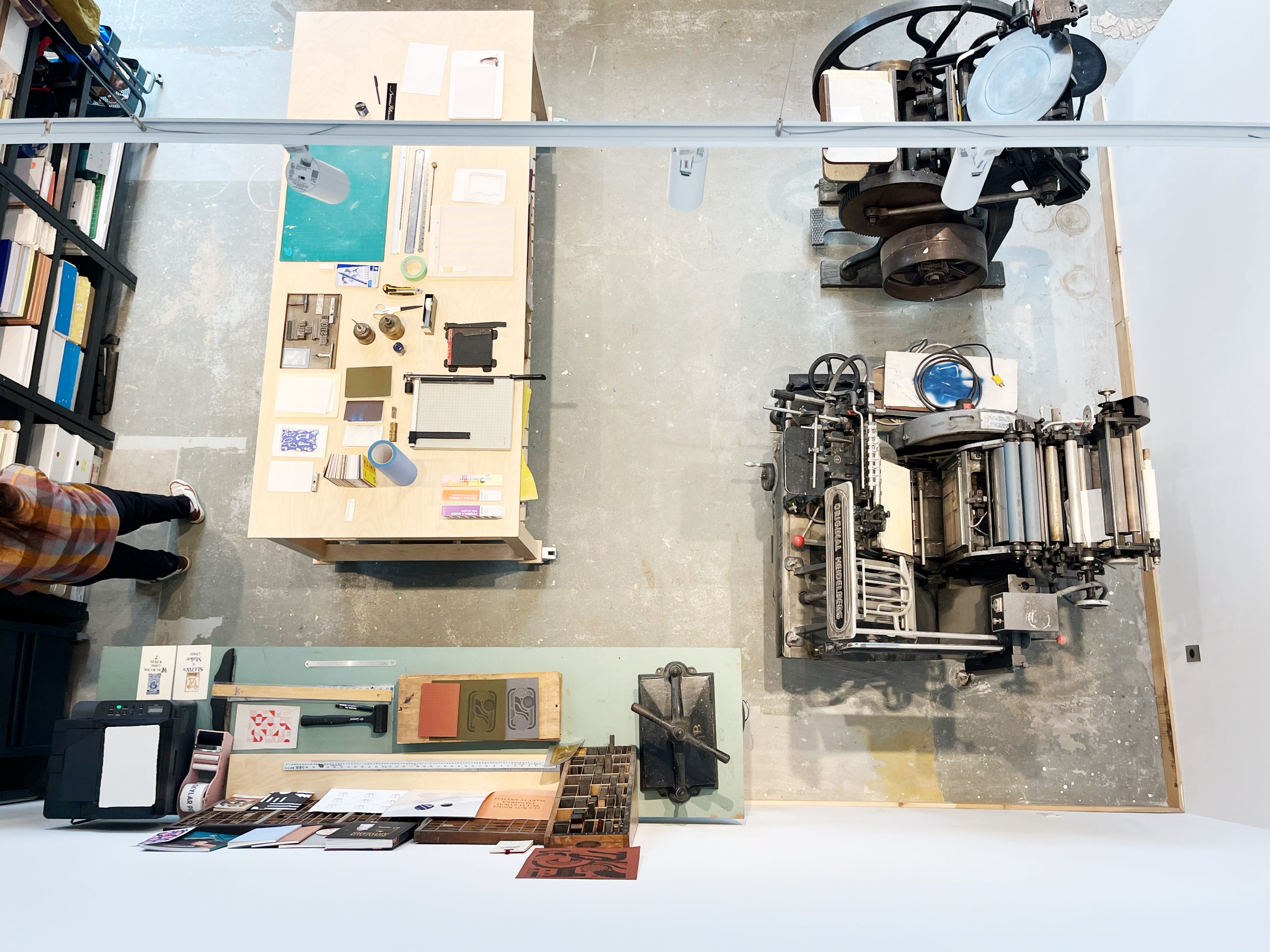 Our workshop has various machines for letterpress and Riso printing, ceramics, bookbinding, semi-automated paper cutting, and die cutting.