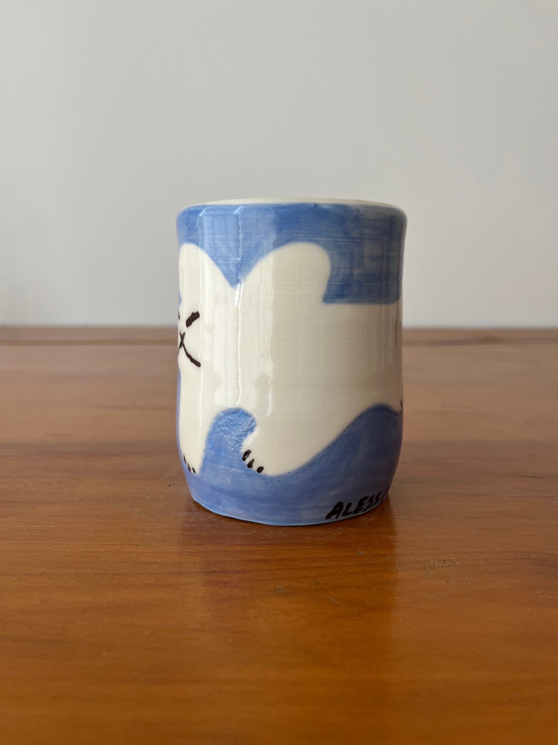 Hand-painted illustration by Aless MC on a vase created by Montreal ceramist Ronald Pothier. This unique 12 cm-high piece is ideal for holding pencils, brushes, flowers, café latté or other items. This vase is part of a collection of 20 pieces illustrated by 19 great names in illustration. Aless MC is LEPORELLO's illustrator-in-residence for June 2025.