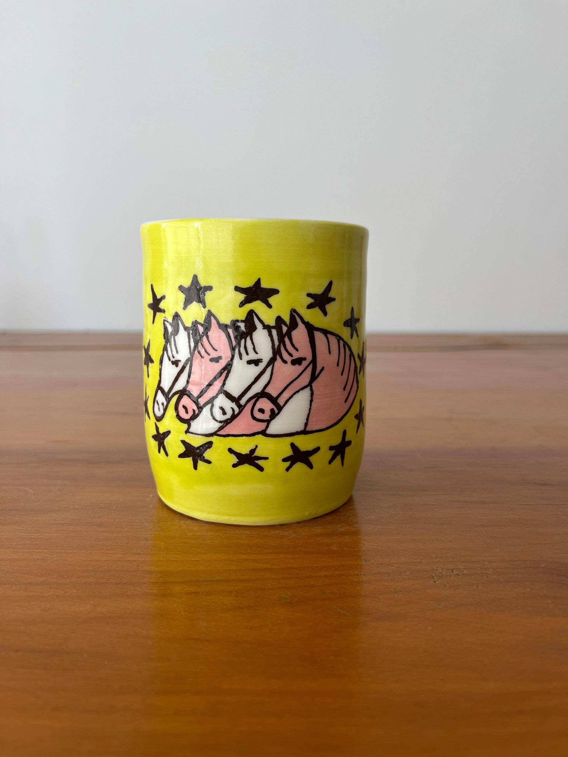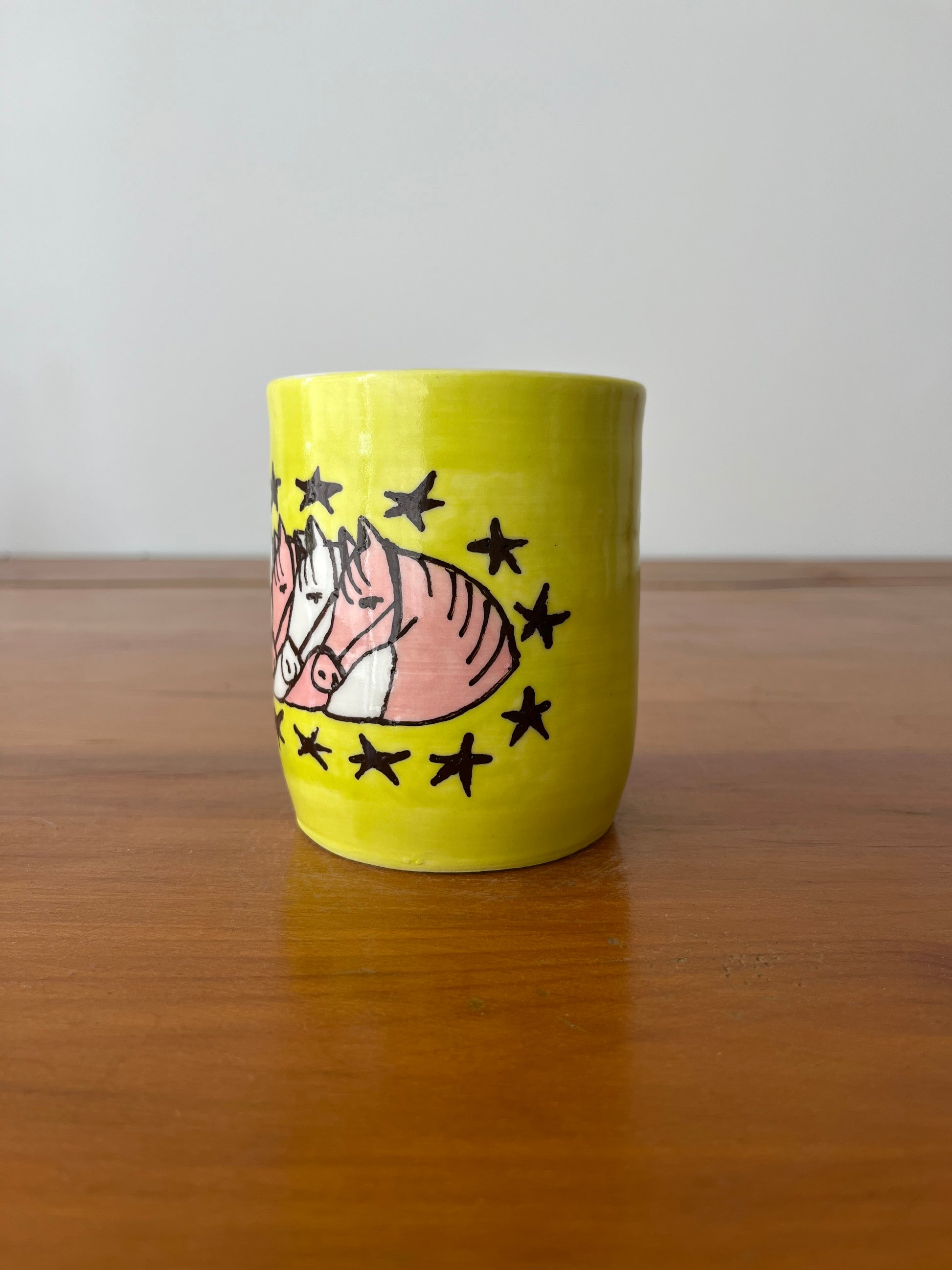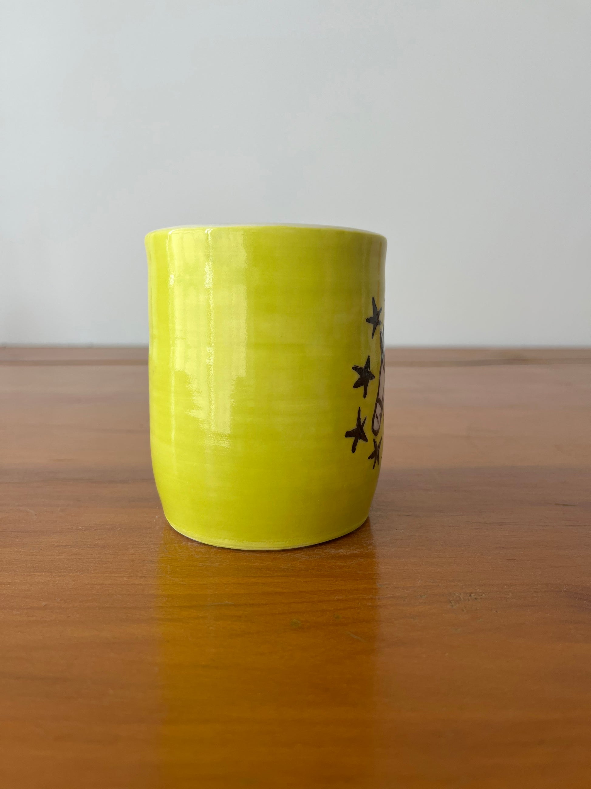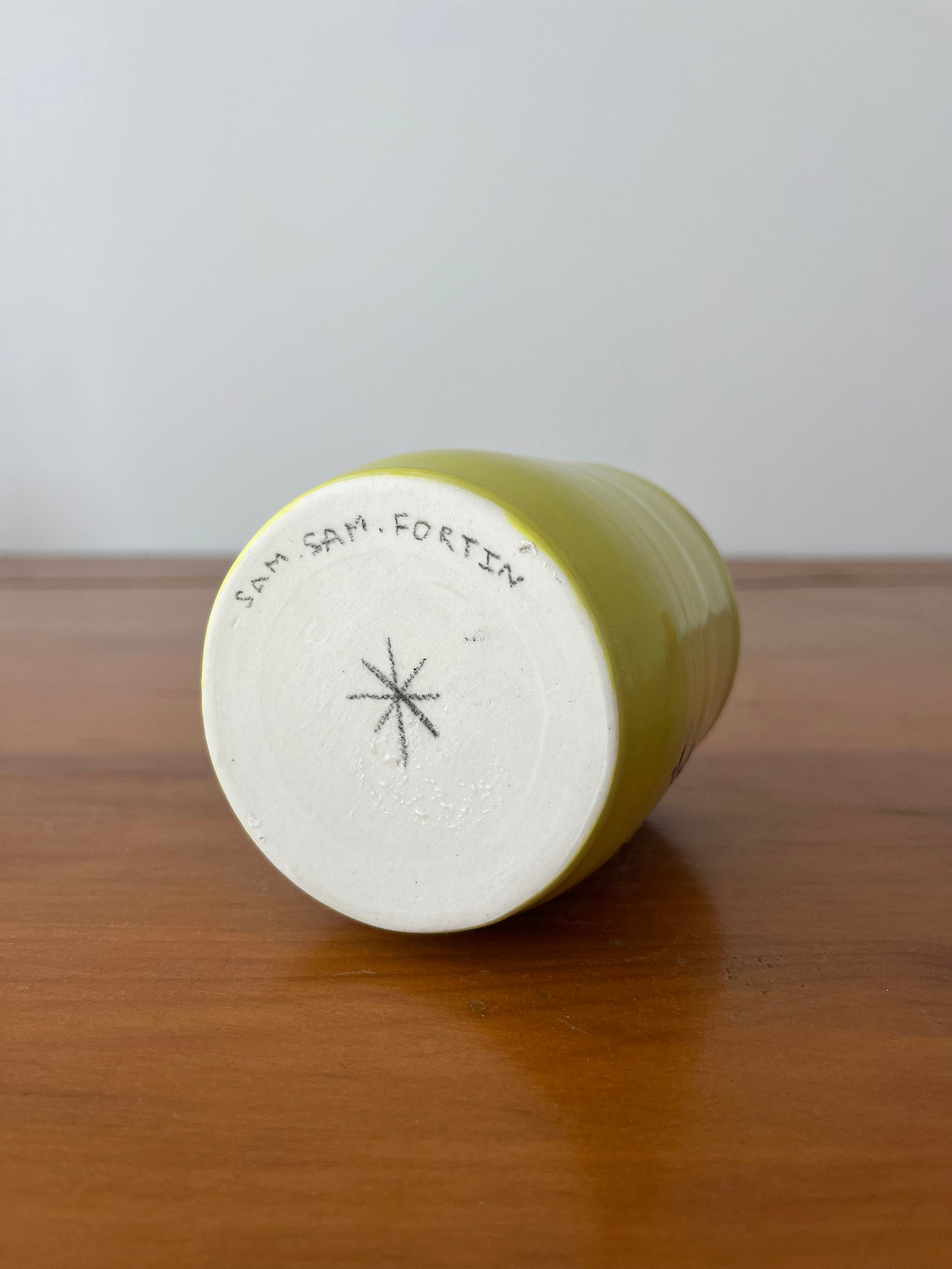 Samuel Fortin's hand-painted illustration on a vase created by Montreal ceramist Ronald Pothier. This unique piece, approximately 12 cm high, is ideal for holding pencils, paintbrushes, flowers, lattes, or other items. This vase is part of a collection of 20 pieces illustrated by 19 great names in illustration. Samuel Fortin is the illustrator in residence at LEPORELLO in July 2025.
