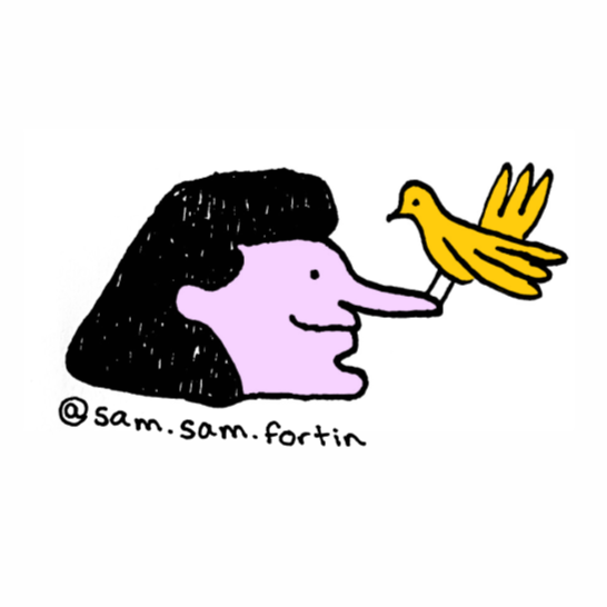 Sticker of an illustration by Samuel Fortin, illustrator in residence at LEPORELLO in July 2025. Format: 3 x 3 inches.