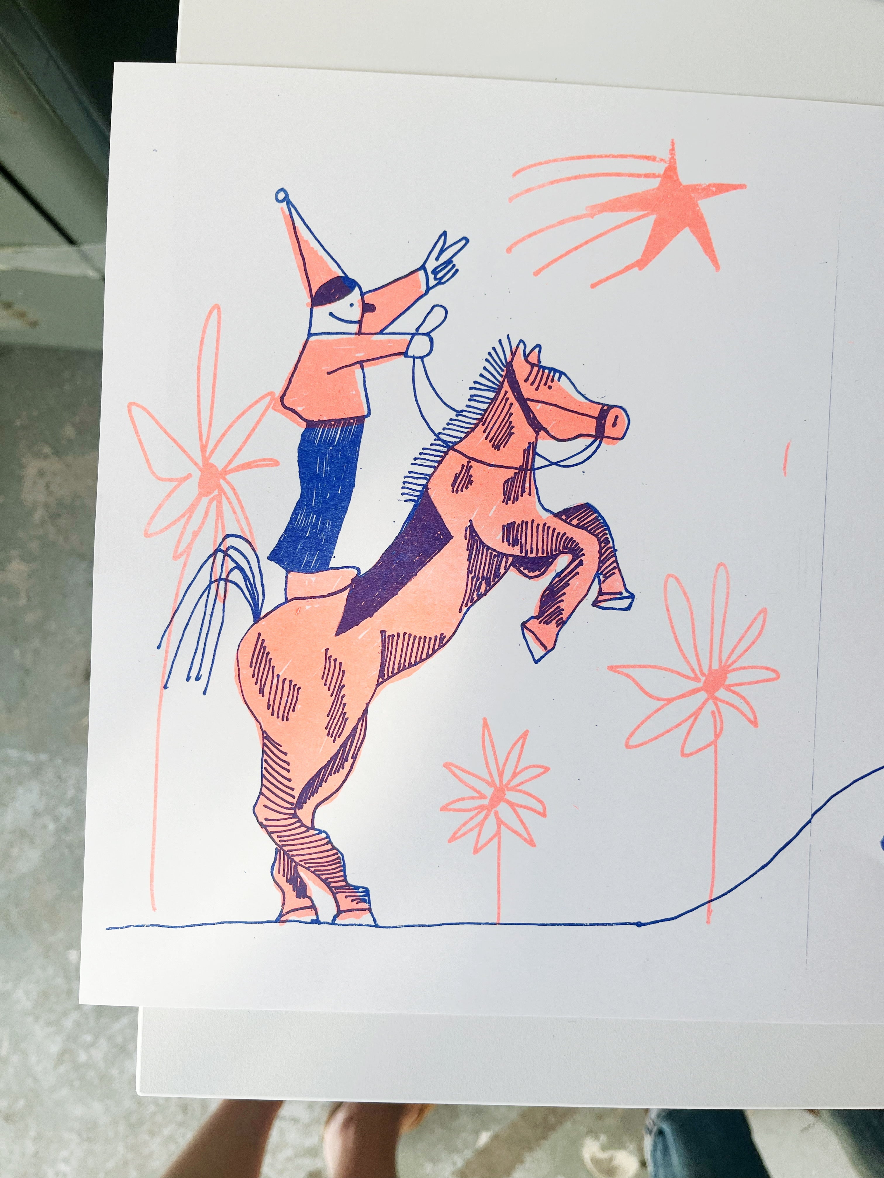 Romane Minner-Barrette — alias Romane MB — s’est consacrée à la création des chandails imprimés en sérigraphie de la marque Toujours Correct, qu’elle a cofondée avec sa sœur Béatrice. Parallèlement à la sérigraphie, Romane poursuit une pratique artistique dans des projets d’illustration et d’animation pour divers clients. Depuis 2019, elle gère également un atelier qui accueille plusieurs artistes aux parcours variés, encourageant la rencontre et la création collective. Dans son travail, elle explore différents matériaux, tels que les pastels gras, le papier mâché et l’acrylique, qu’elle utilise aussi pour faire des animations. Elle travaille de façon instinctive, un peu touche-à-tout, en explorant souvent ce qui est brut, frais, vivant.