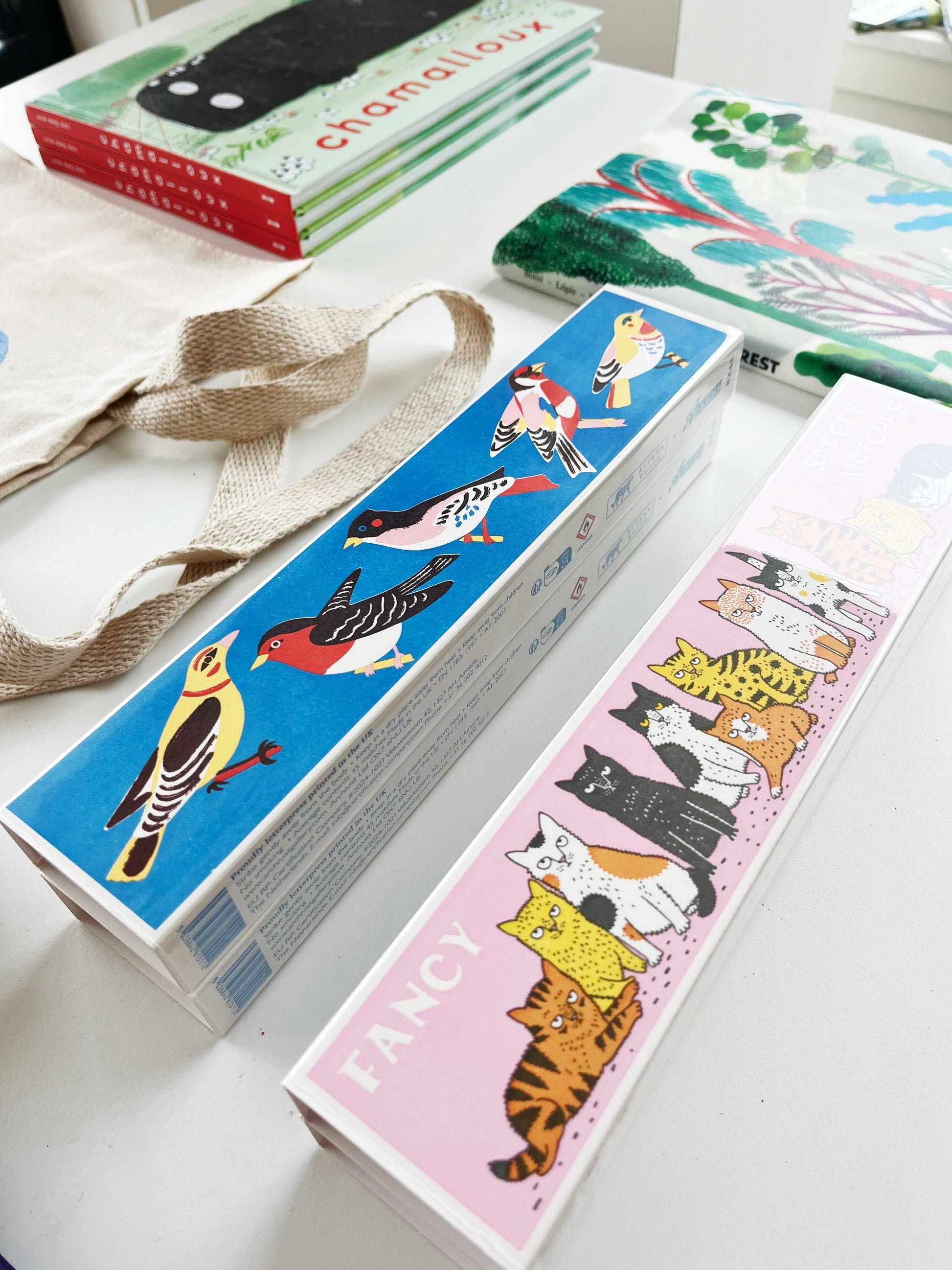Longue boîte d'allumettes représentant cinq oiseaux aux couleurs vives sur un fond bleu éclatant.