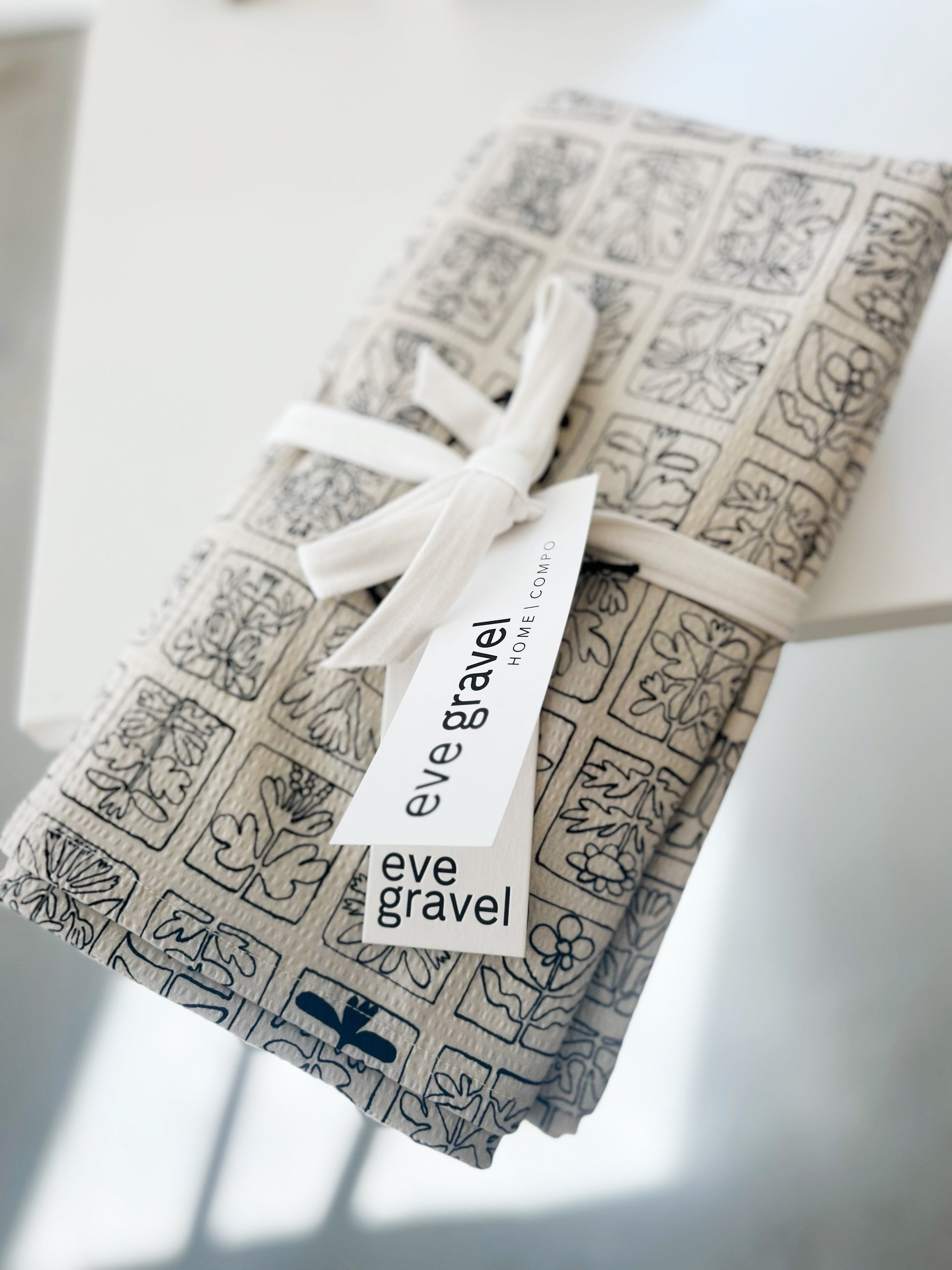 La designer de mode montréalaise Ève Gravel utilise les surplus de tissu de ses collections de vêtements pour créer les pièces qui composent sa collection de linge de maison. Motif composé de tuiles florales créé en collaboration avec l’illustratrice Julia GR.