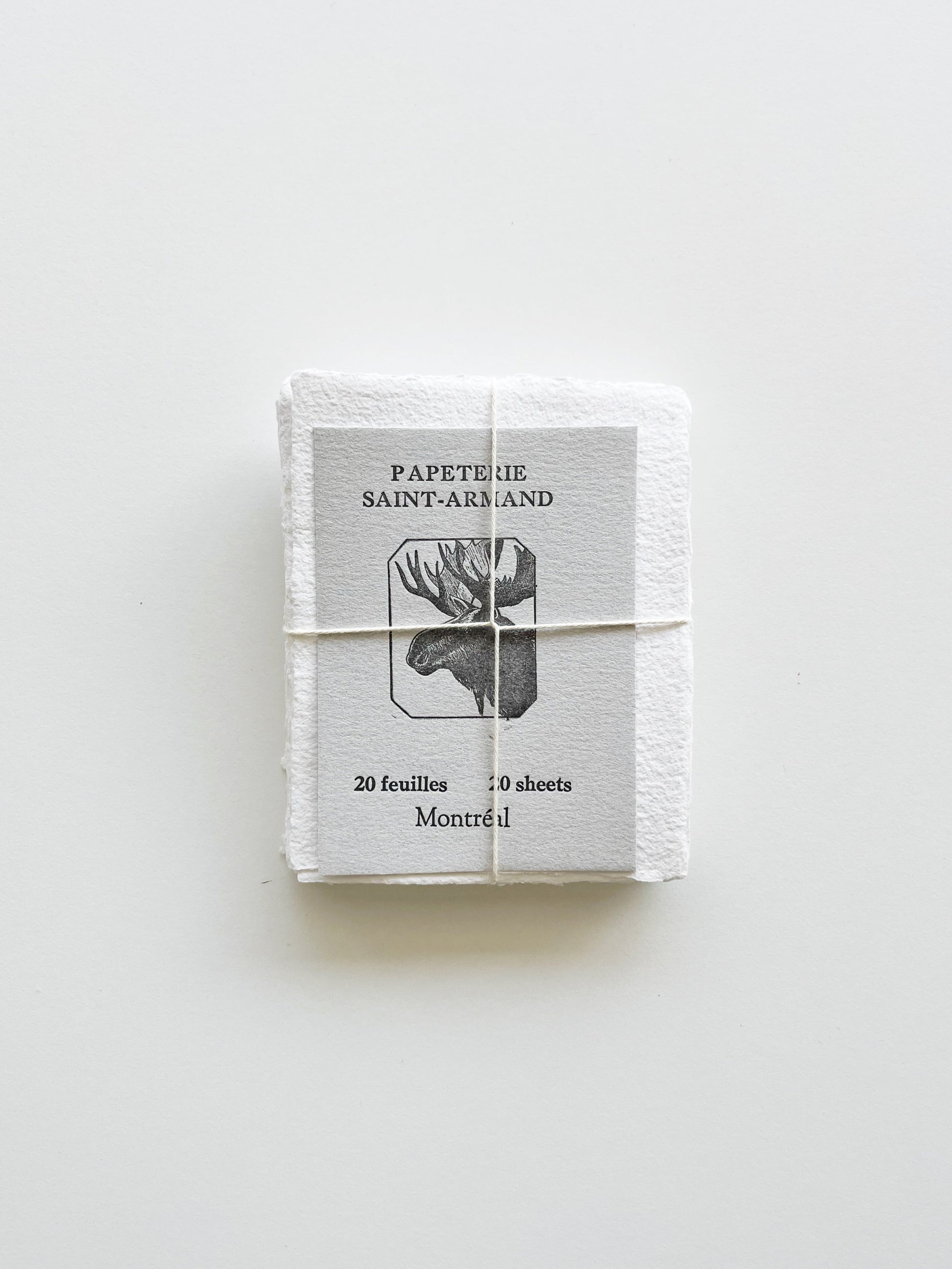 Paquet de 20 feuilles de papier artisanal blanc fabriqué à Montréal. Parfait pour le bricolage, l'aquarelle, l'impression, l'encre et le gauffrage. 100% coton. Épaisseur de 150 lb (320 g).