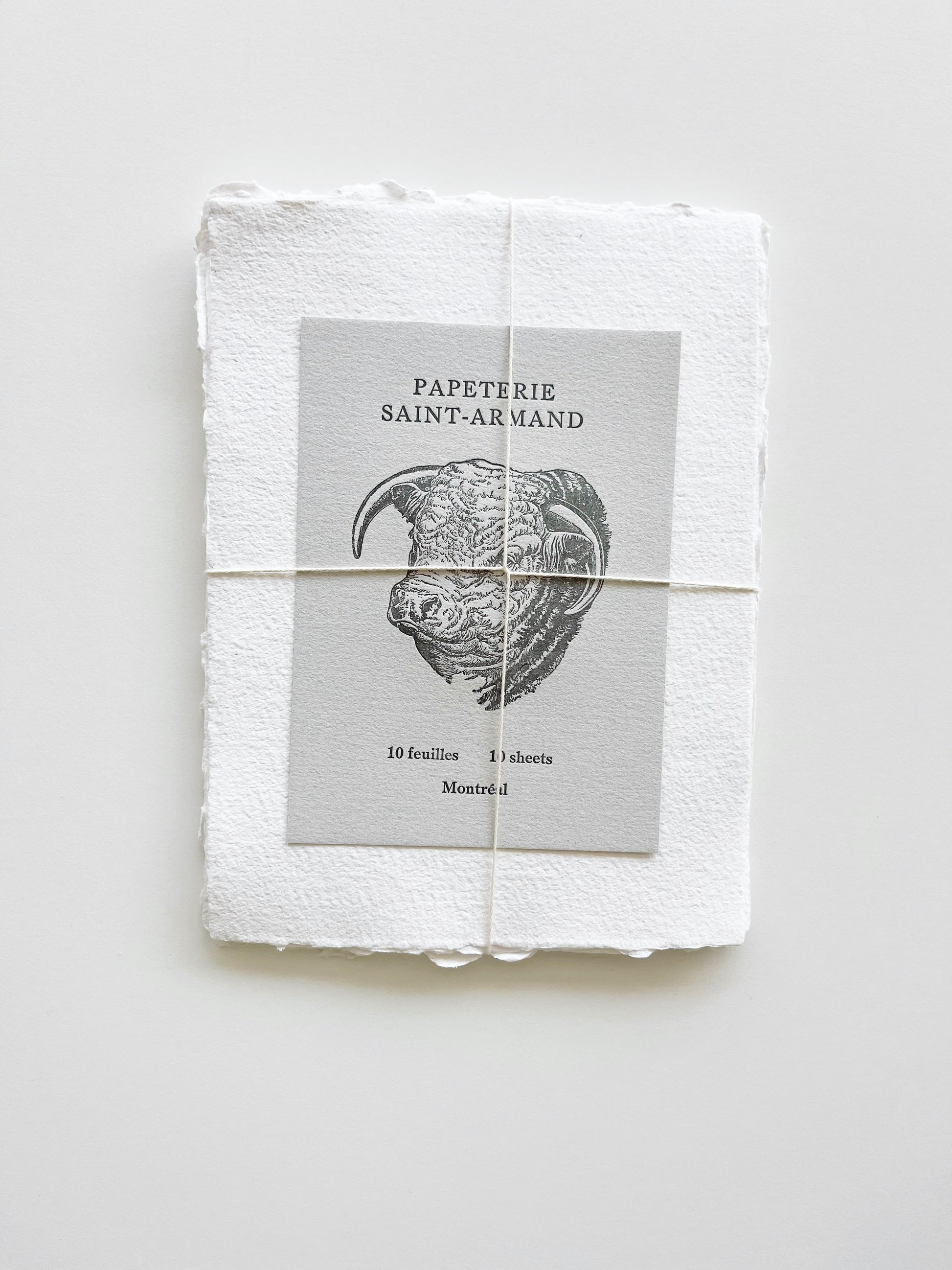 Paquet de 10 feuilles de papier artisanal blanc fabriqué à Montréal. Parfait pour le bricolage, l'aquarelle, l'impression, l'encre et le gauffrage. 100% coton. Épaisseur de 150 lb (320 g).