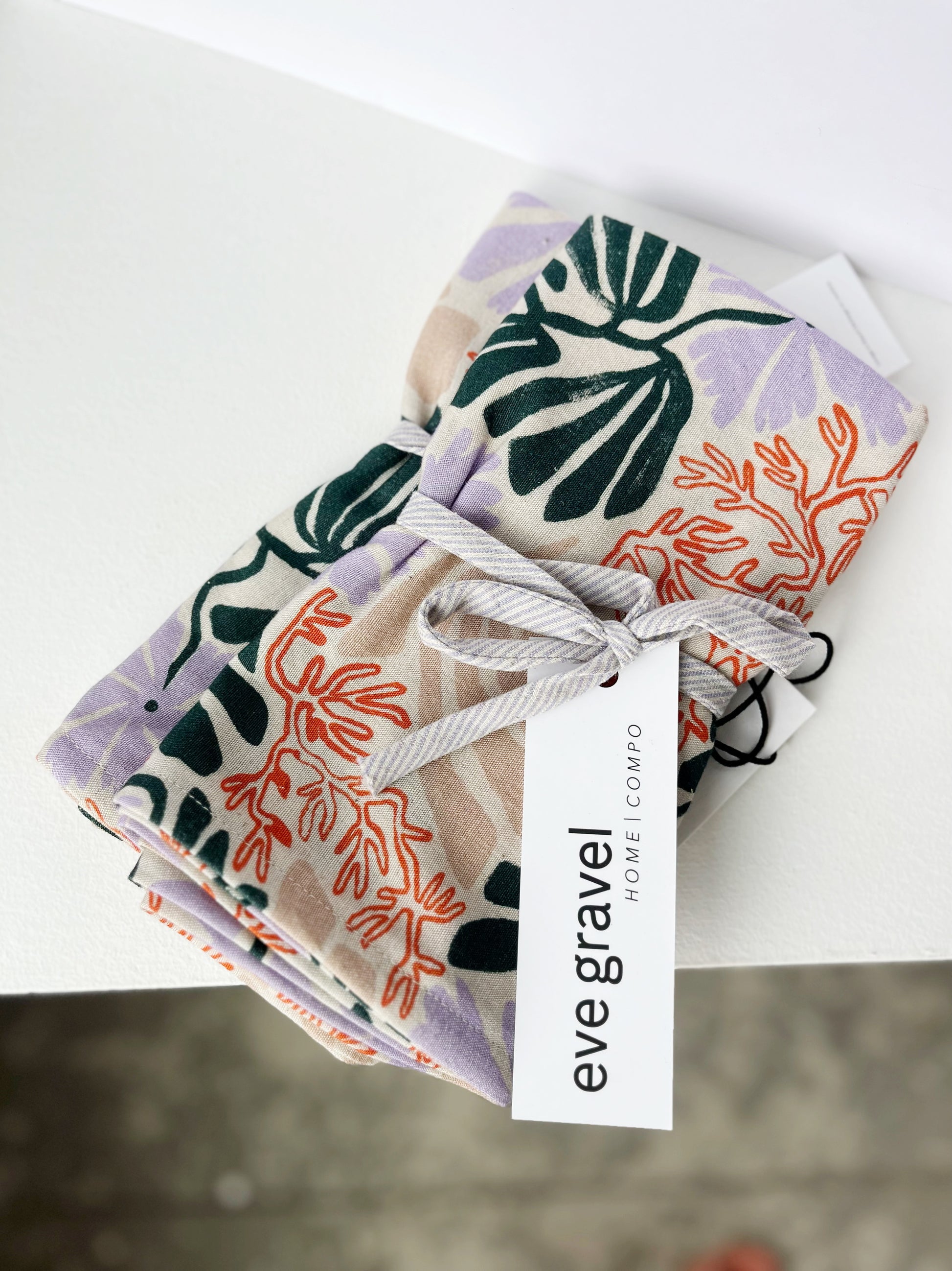 Lot de 2 serviettes en viscose, coton et lin. La designer de mode montréalaise Ève Gravel réutilise les surplus de tissu de ses collections de vêtements pour créer les pièces qui composent sa collection de linge de maison. Motif tout en fleurs créé en collaboration avec l’illustratrice Julia GR.